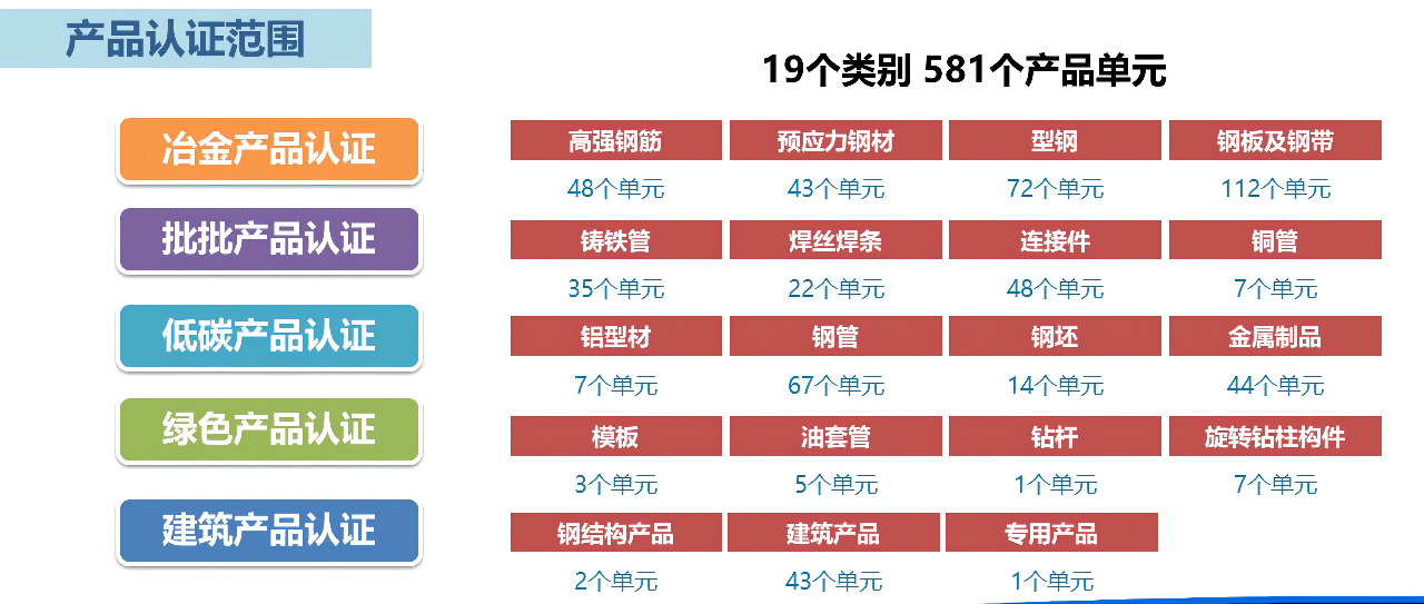 产品认证范围涵盖建筑用钢筋、预应力钢材、钢筋焊网、型钢、铸 管、板卷、钢结构、围护系统、铝型材等19个产品类别,涉及400余个具体产品,目前认证客 户150多家,遍布我国30多个省市及马来西亚。