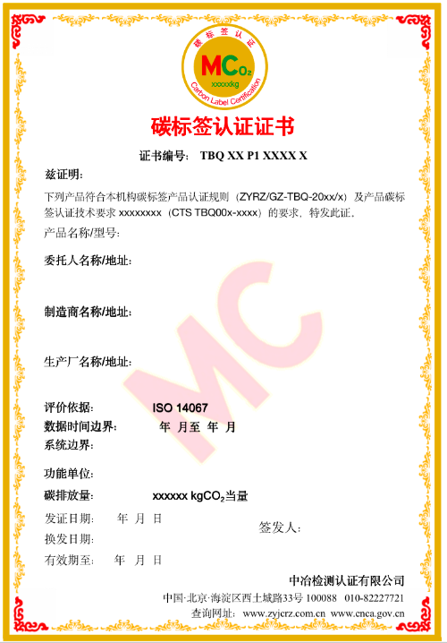 碳标签认证证书模板