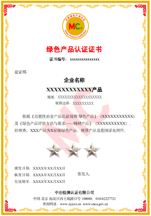 自2018年起,中冶MC认证在产品质量保障的基础上,为企业帮助企业梳理和正规化管控碳排放、能源、环保等方面工作。绿色产品认证依据标准《绿色产品评价方法与要求 钢材产品》,从节约资源、 节约能源、环境友好、无毒无害和可循环利用五个绿色特征对符合产品性能和安全要求的产品进行评价。评价涉及到钢铁领 域主要产品的合金节约量、成材率、清洁能源使用、燃料燃烧效率、废气余热回收利用、噪声(制造过程)、 碳排放、污染排放、危险固体废弃物、含铁尘泥钢渣等多项环保、节能指标,对生产企业进行分级评价。